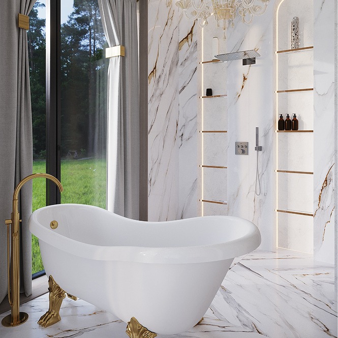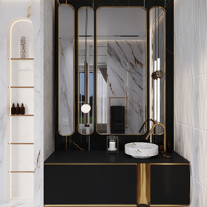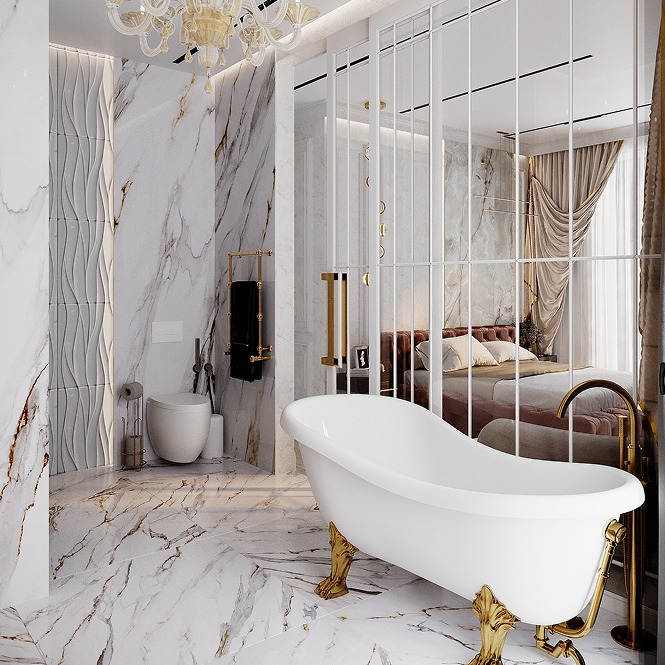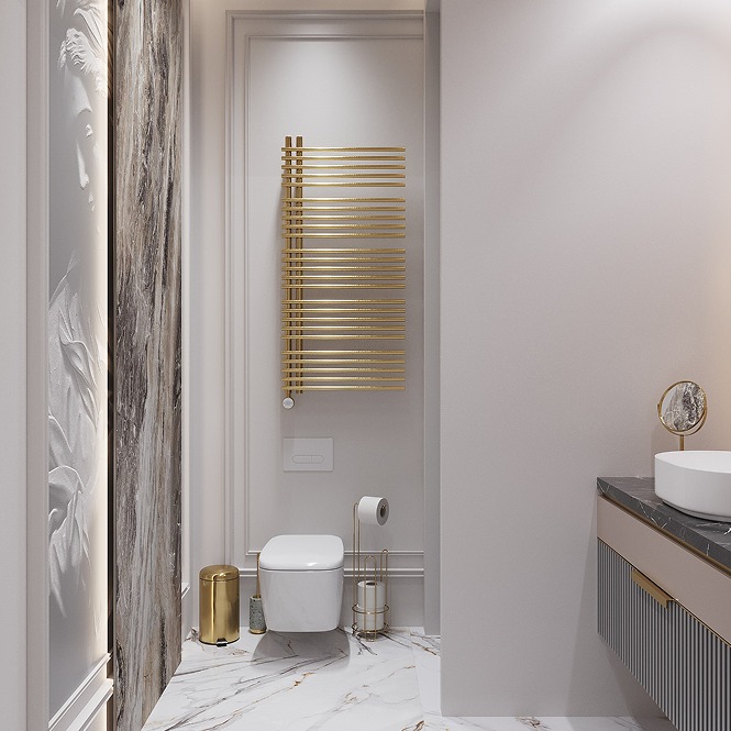 Золотые детали в отделке, мебели и светильниках подчеркивают статусность пространства и добавляют ему утончённого блеска.