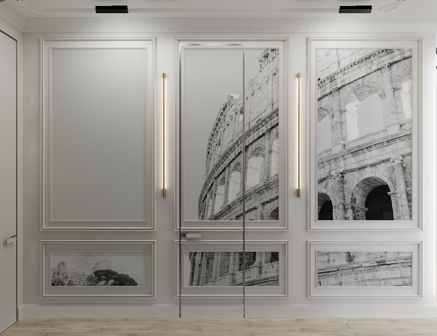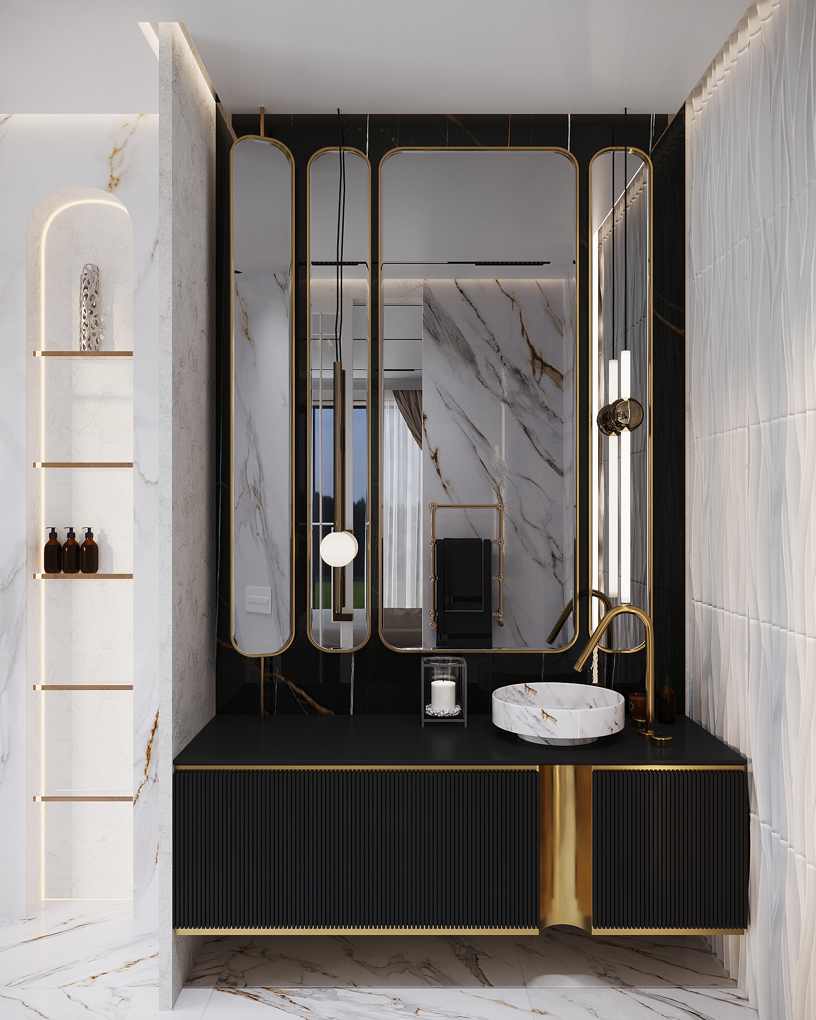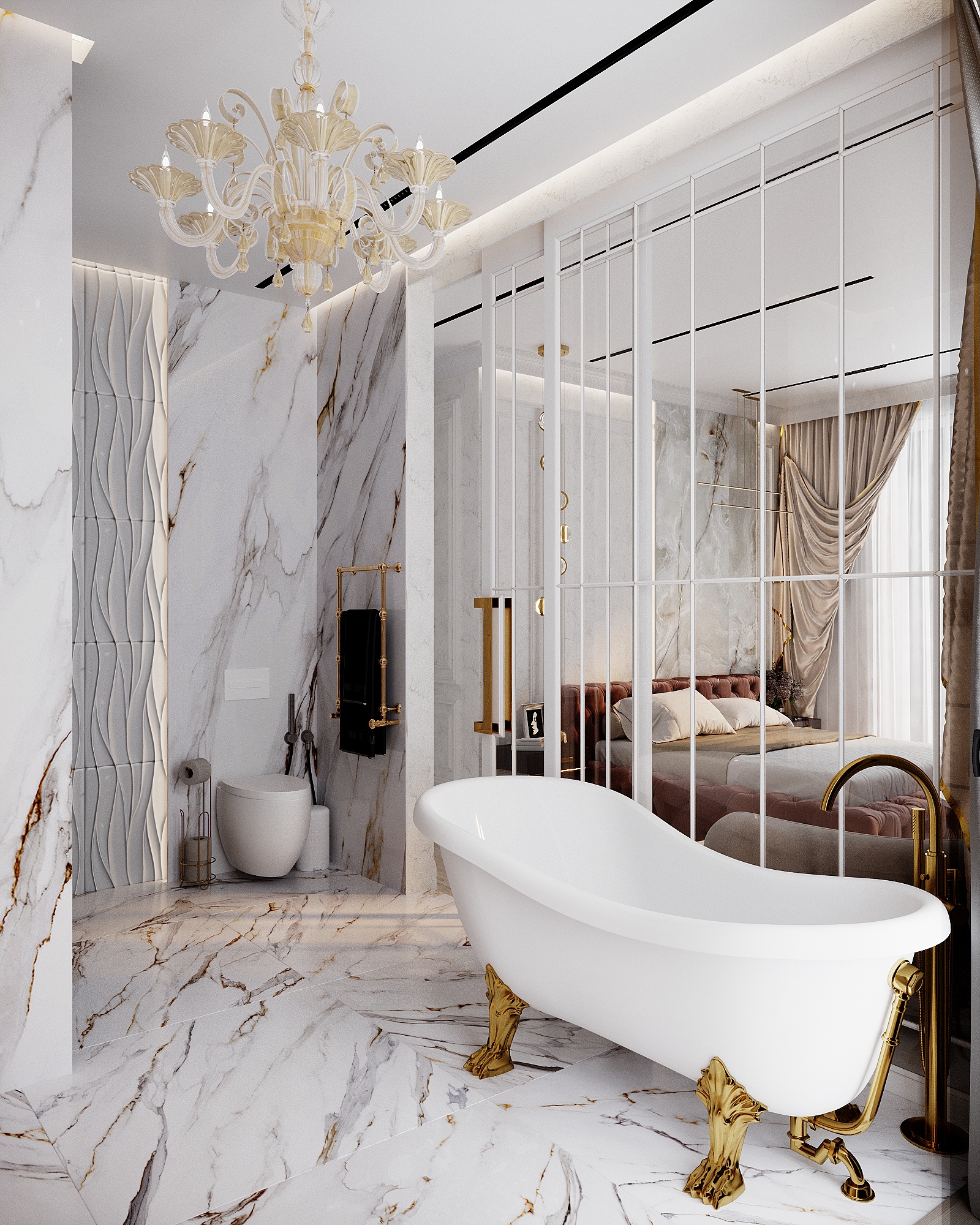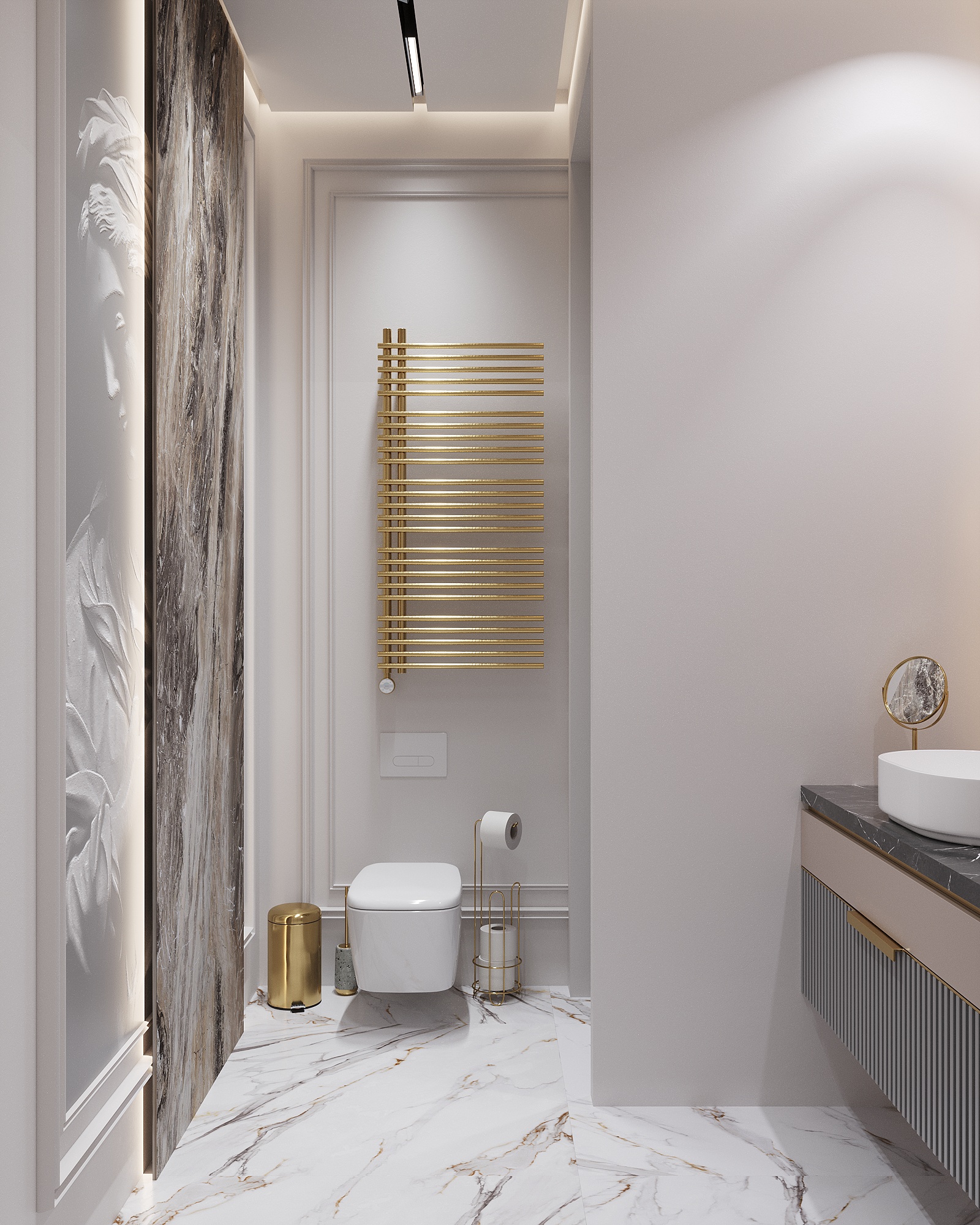 Золотые детали в отделке, мебели и светильниках подчеркивают статусность пространства и добавляют ему утончённого блеска.