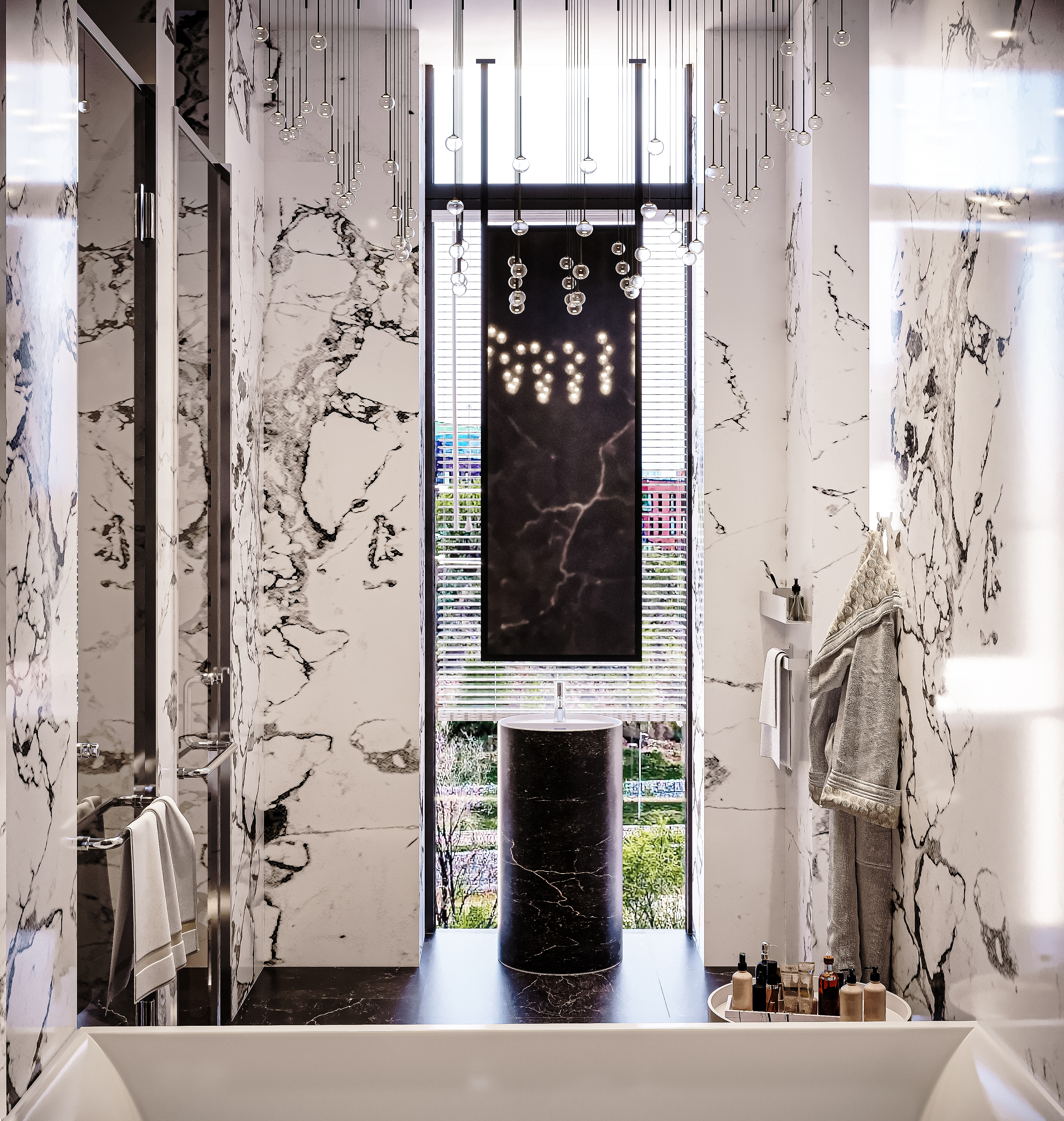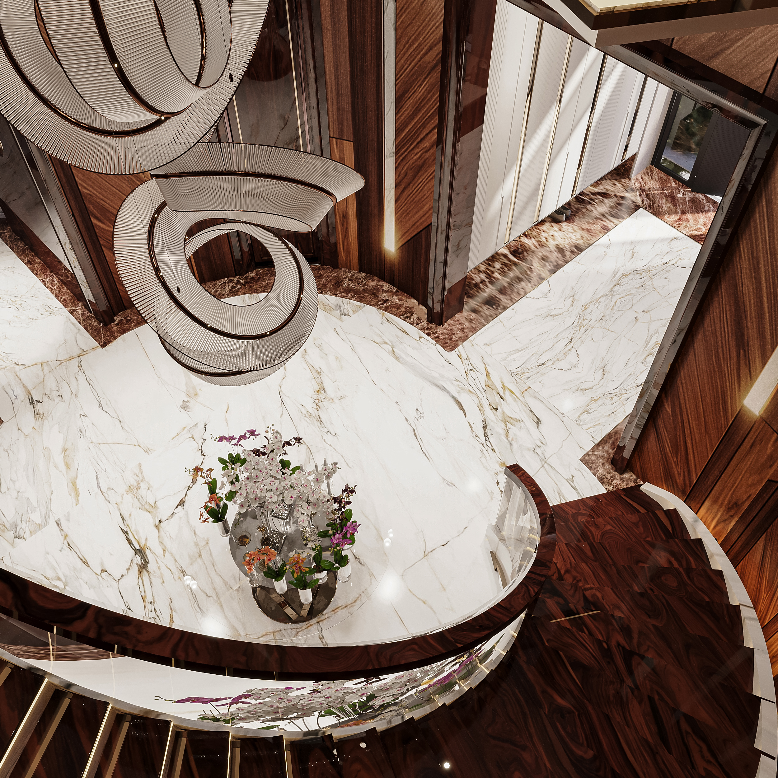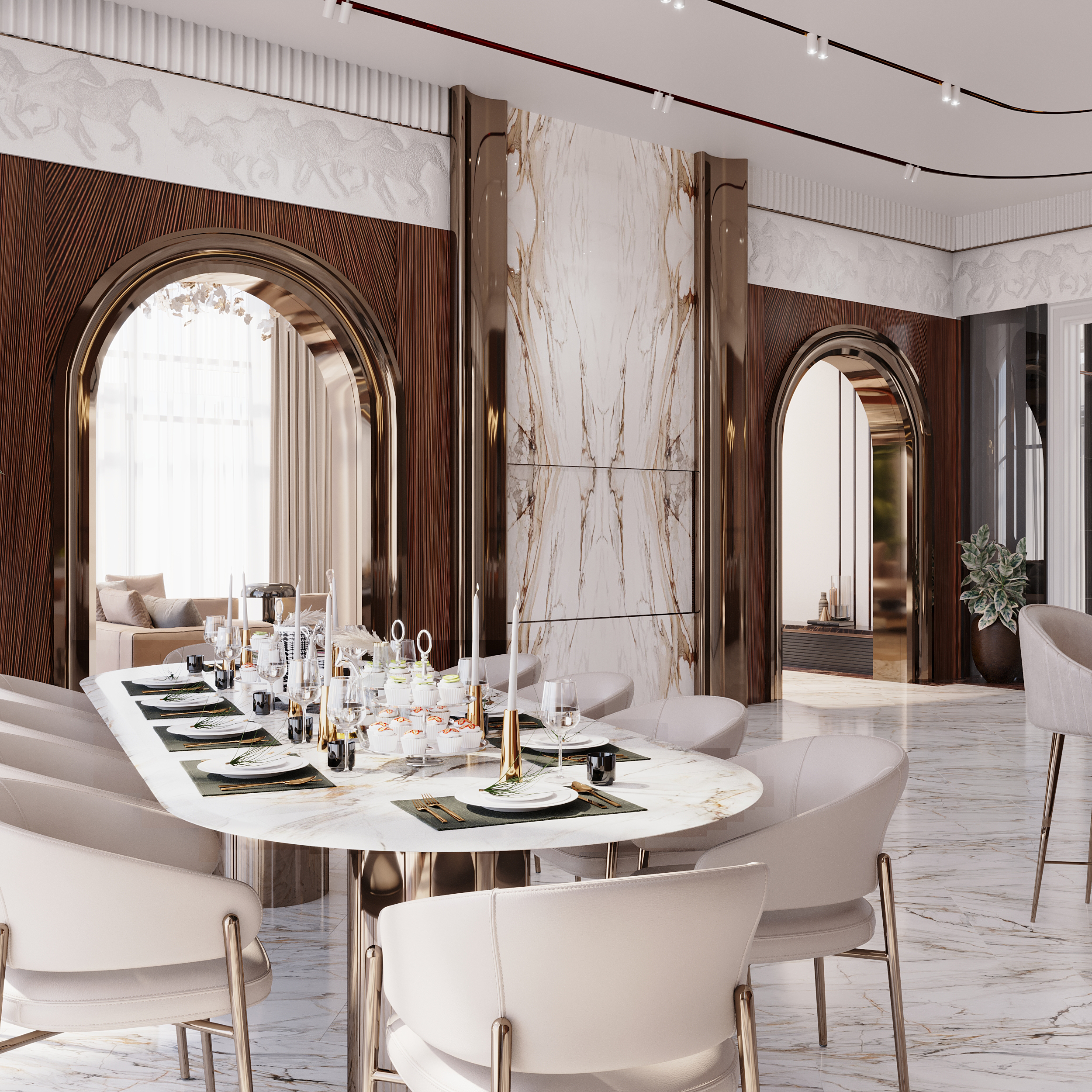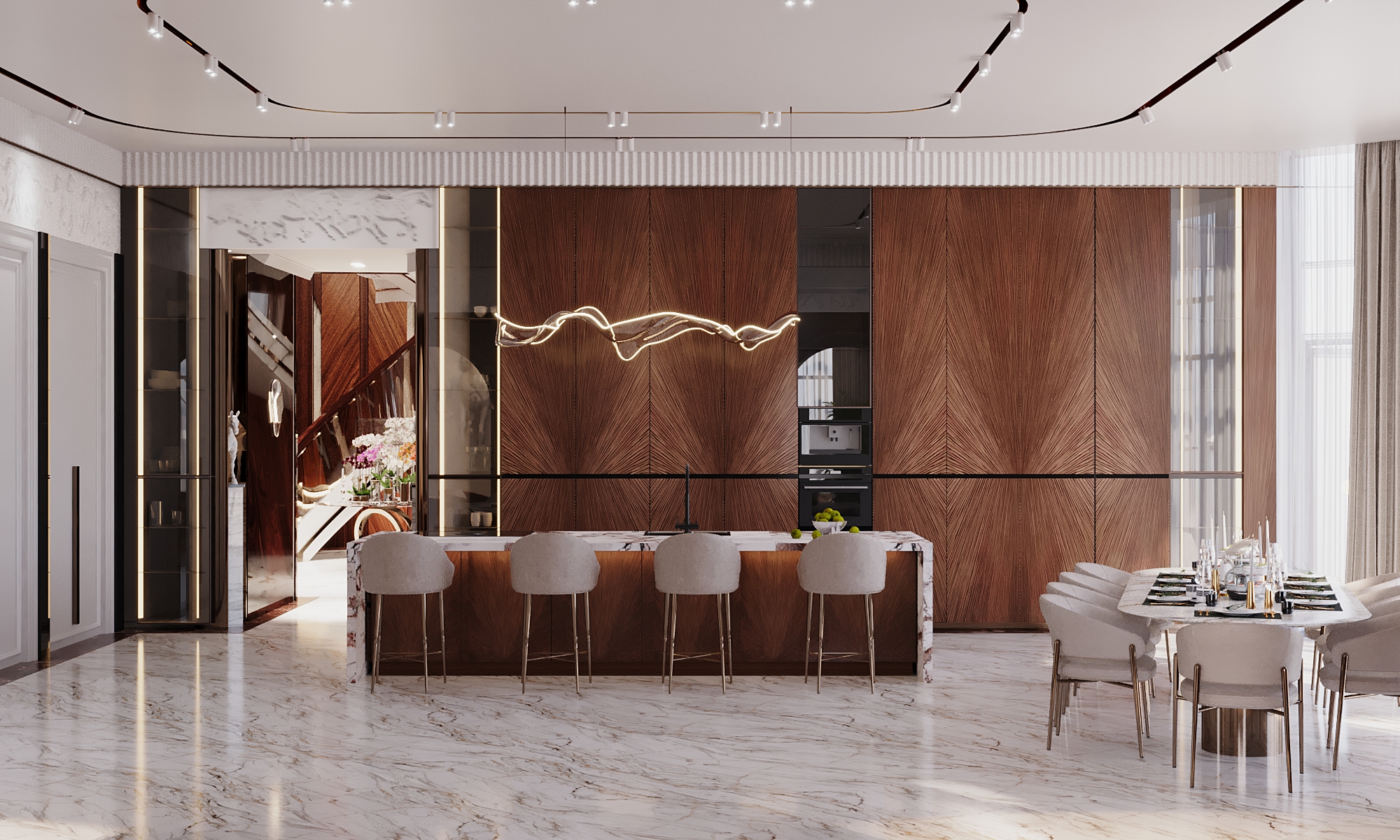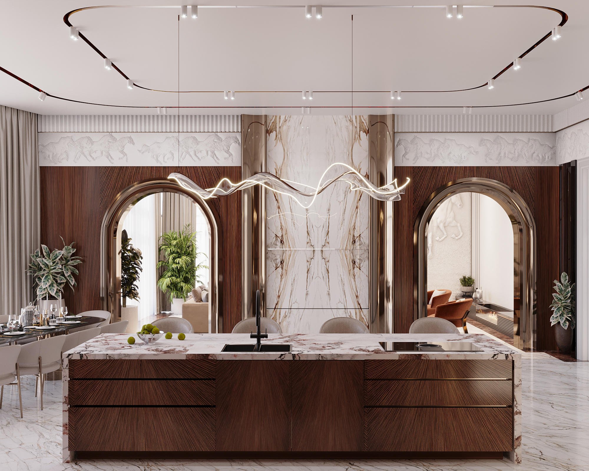 Интерьер сочетает светлый натуральный мрамор и благородные древесные текстуры, очень много металлических акцентов тёплого оттенка. Общественная зона формирует архитектурную структуру интерьера и подчёркивает эстетику современной неоклассики. Приватные помещения дома выполнены в более спокойное и камерной эстетики. Главная спальня оформлена с использованием мягких декоративных стеновых панелей и приглушенного освещения, создающего атмосферу уюта и приватности. В результате пространство выглядит статусно, гармонично и при этом остается комфортным для жизни большой семьи
