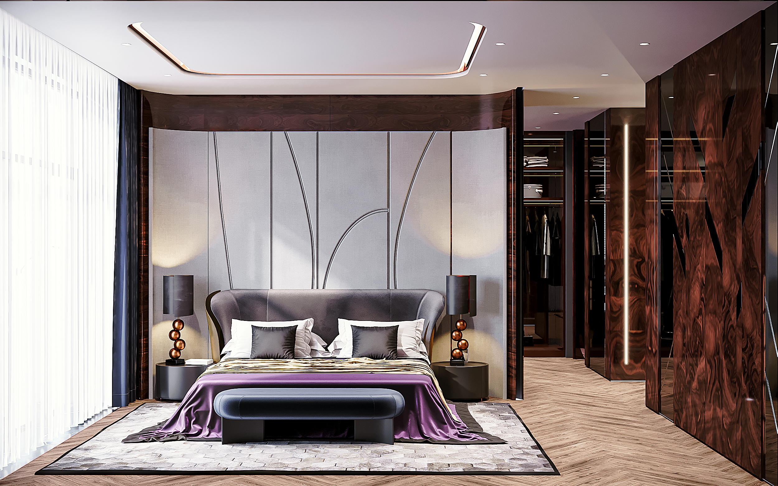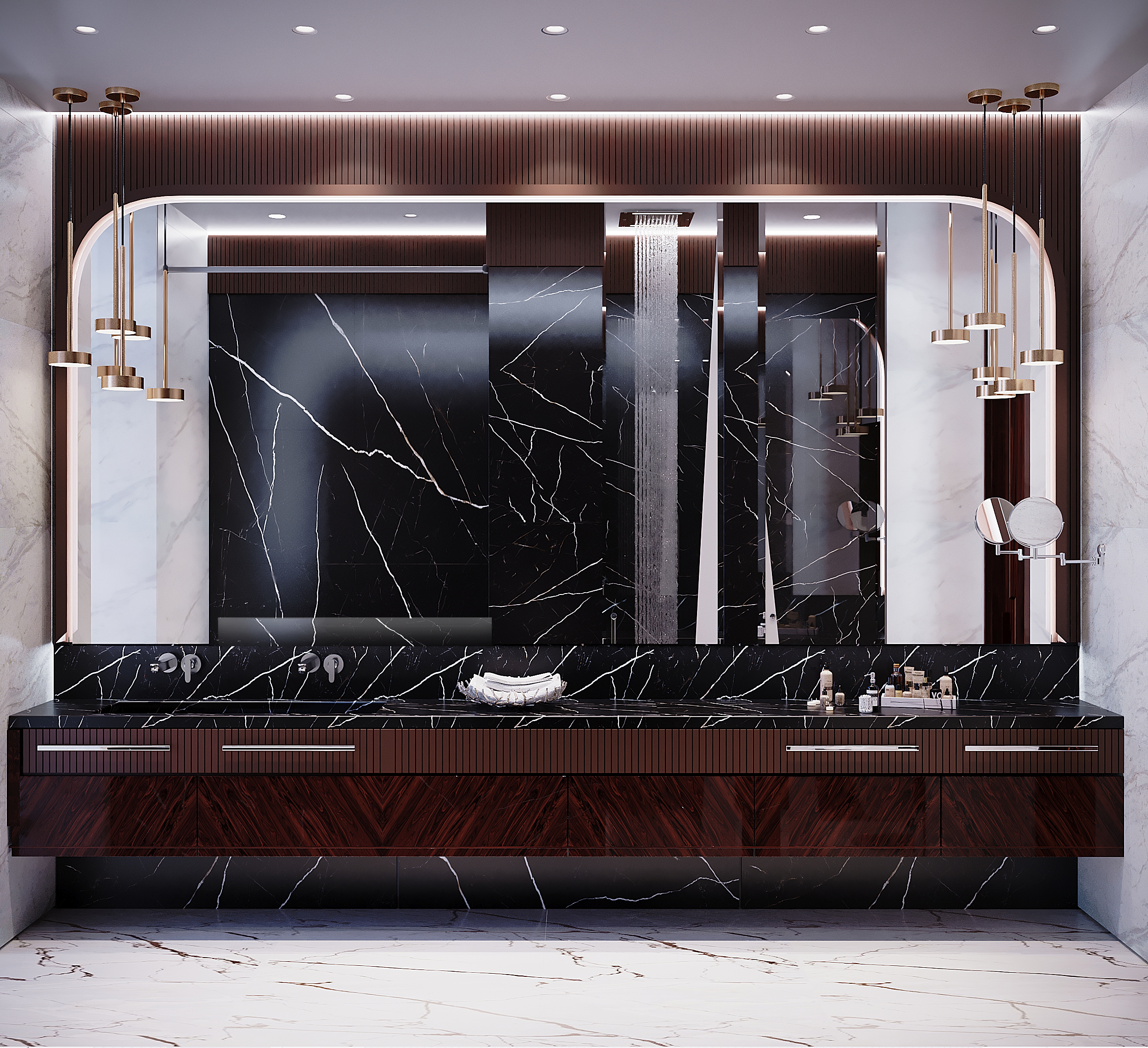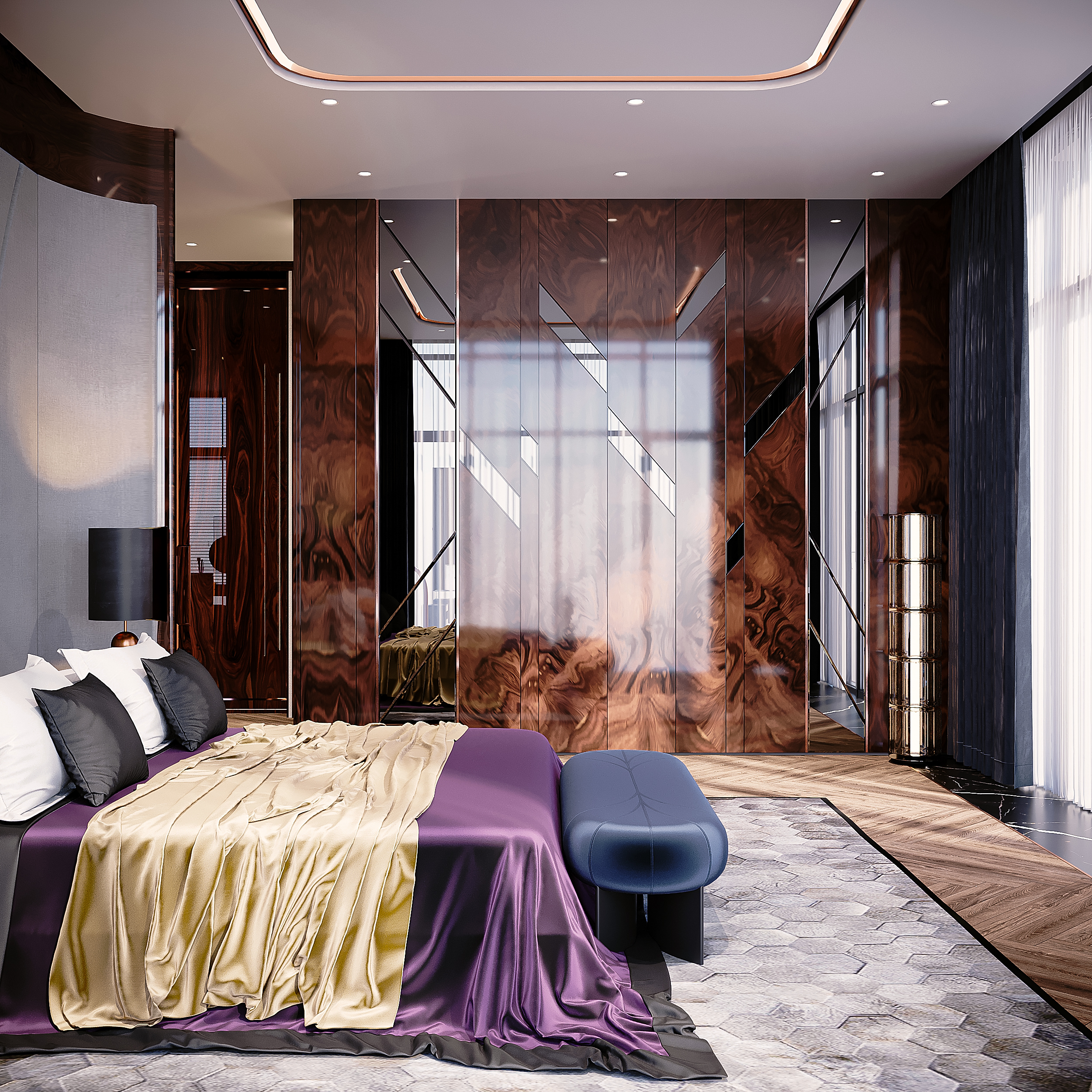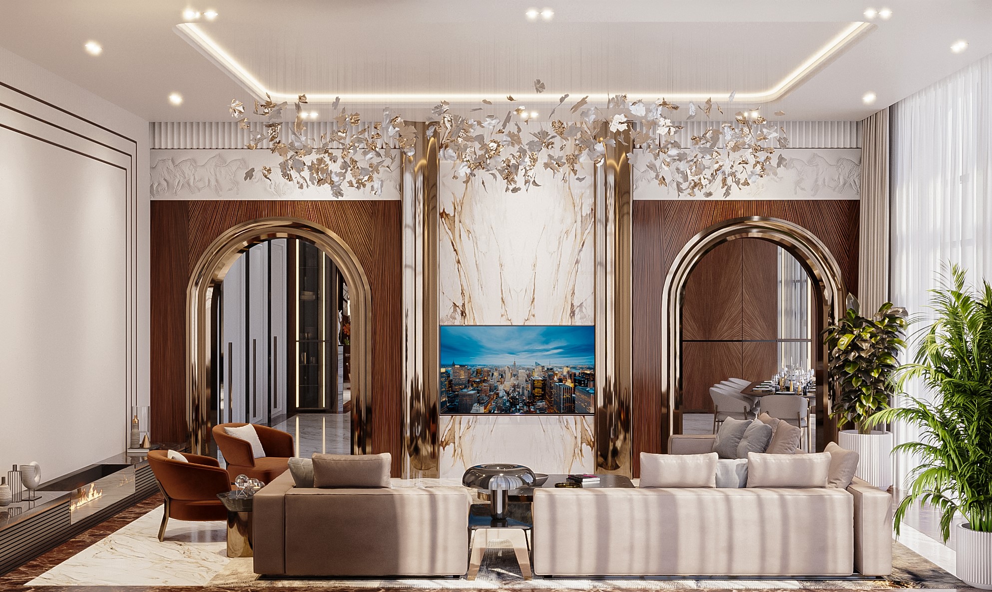 Интерьер сочетает светлый натуральный мрамор и благородные древесные текстуры, очень много металлических акцентов тёплого оттенка. Общественная зона формирует архитектурную структуру интерьера и подчёркивает эстетику современной неоклассики. Приватные помещения дома выполнены в более спокойное и камерной эстетики. Главная спальня оформлена с использованием мягких декоративных стеновых панелей и приглушенного освещения, создающего атмосферу уюта и приватности. В результате пространство выглядит статусно, гармонично и при этом остается комфортным для жизни большой семьи