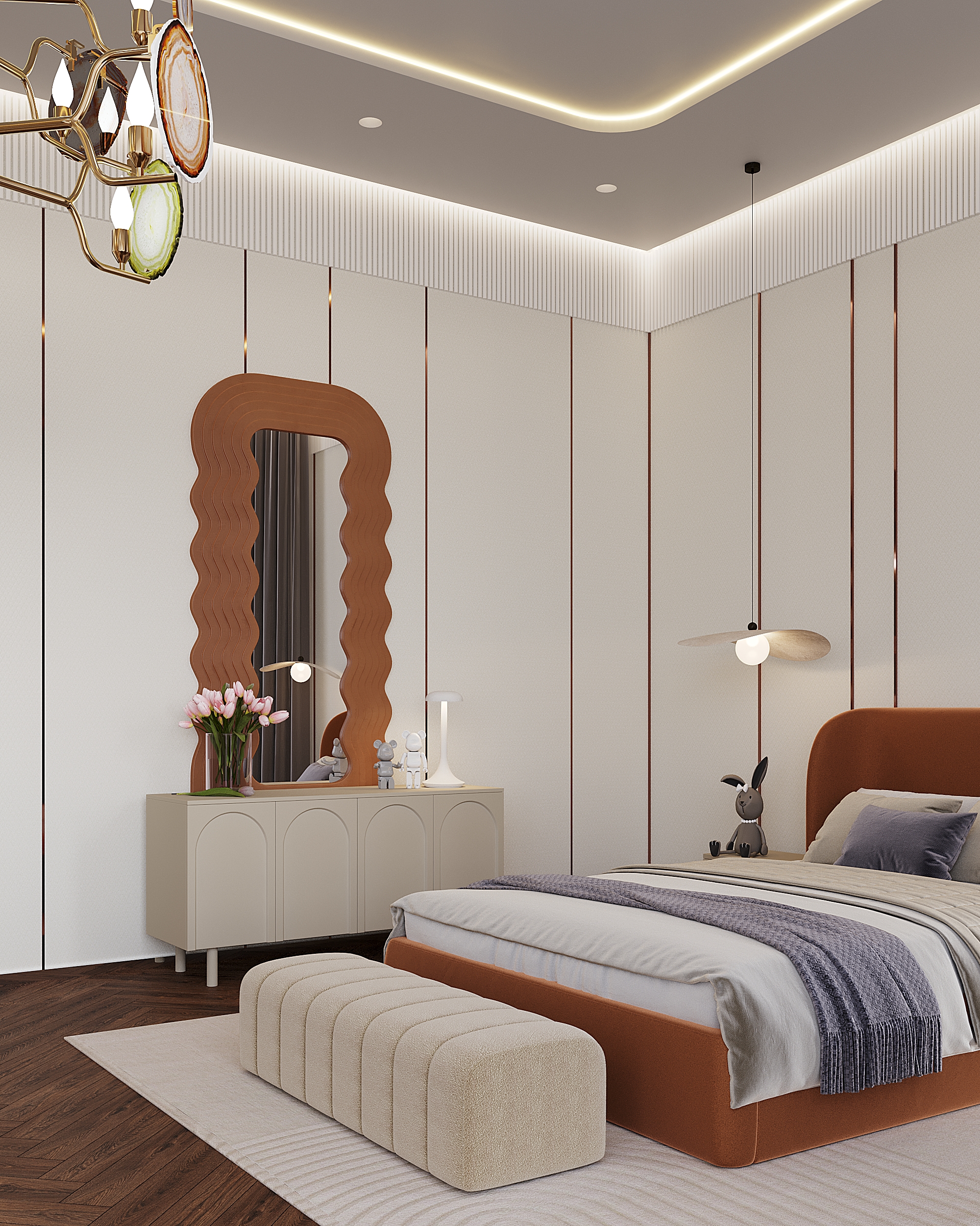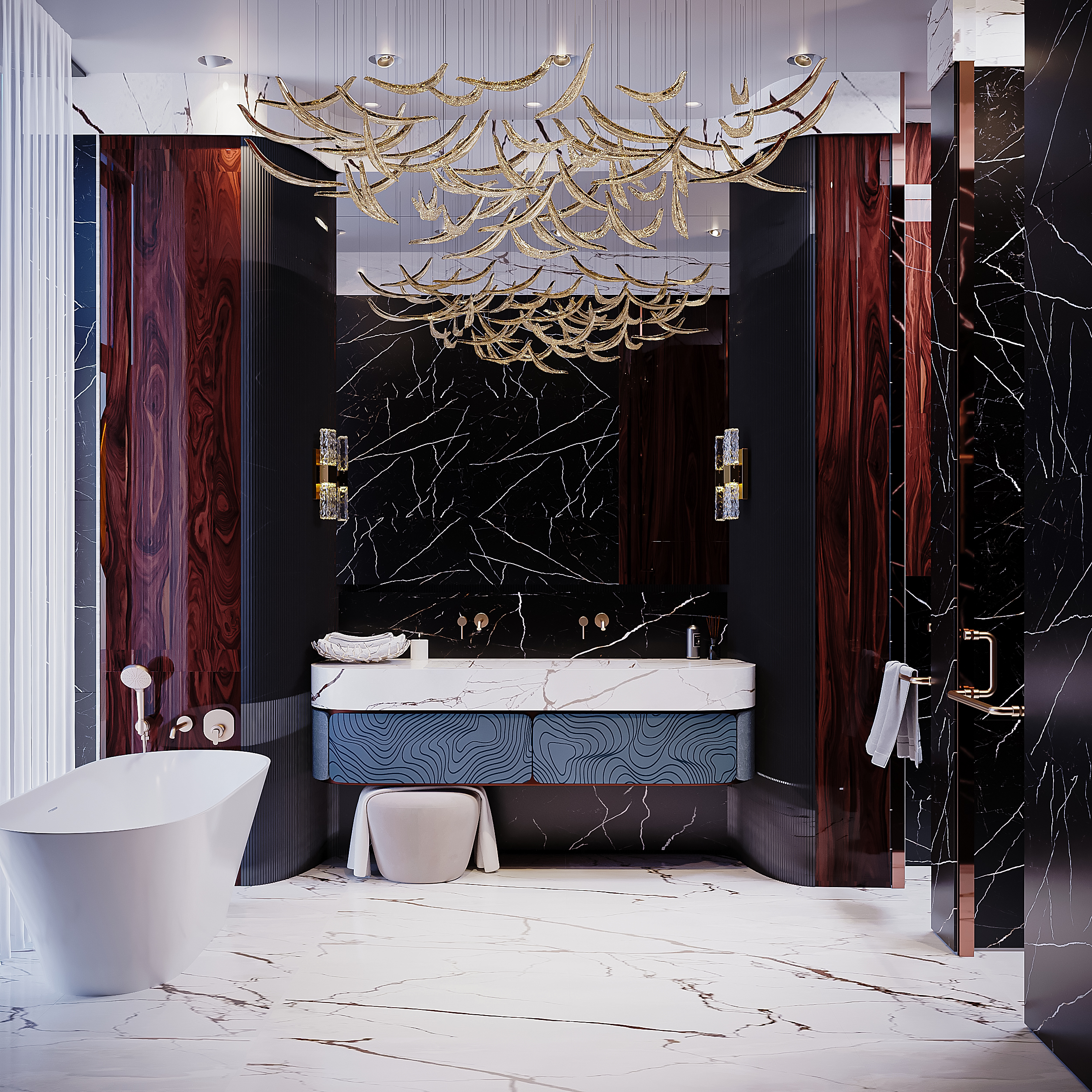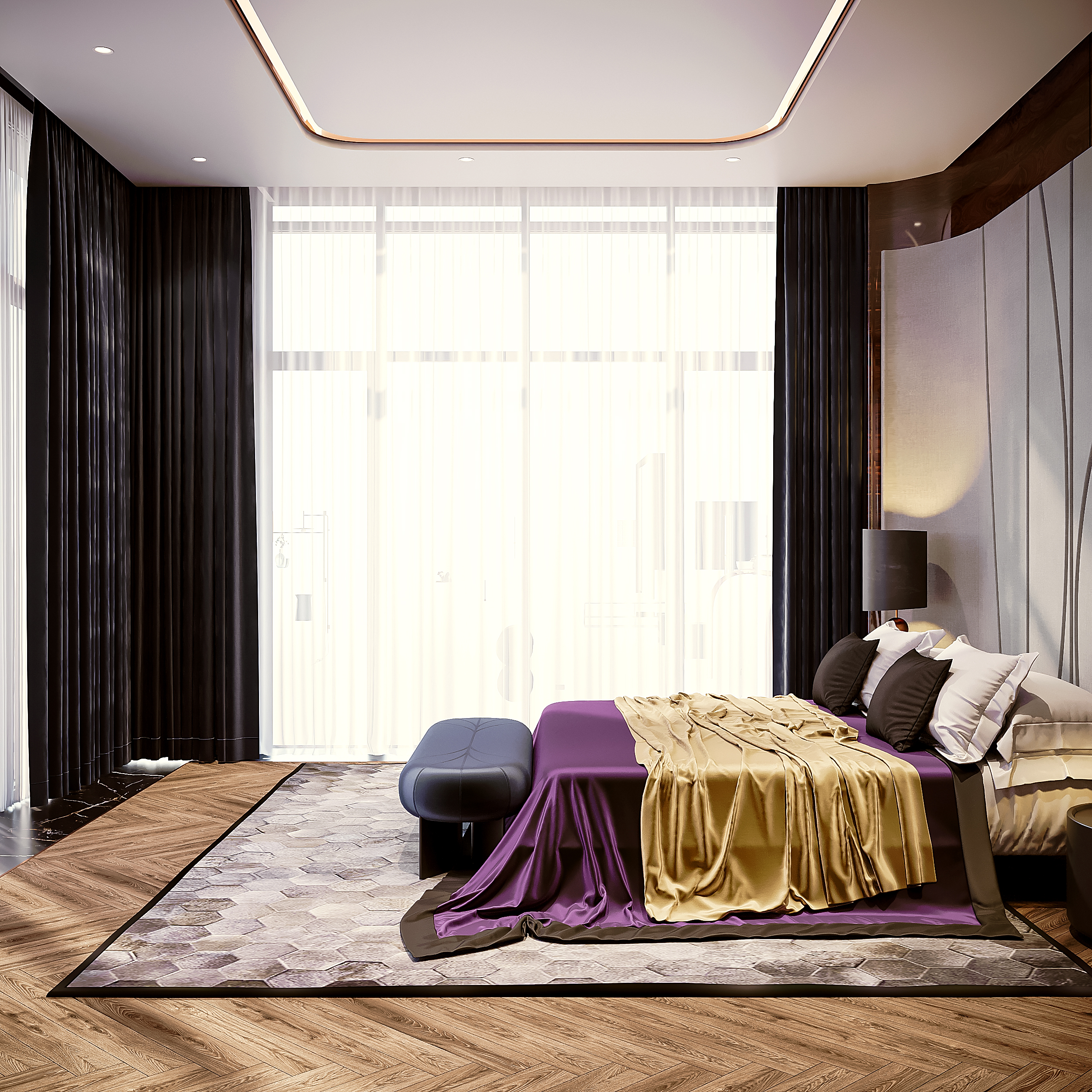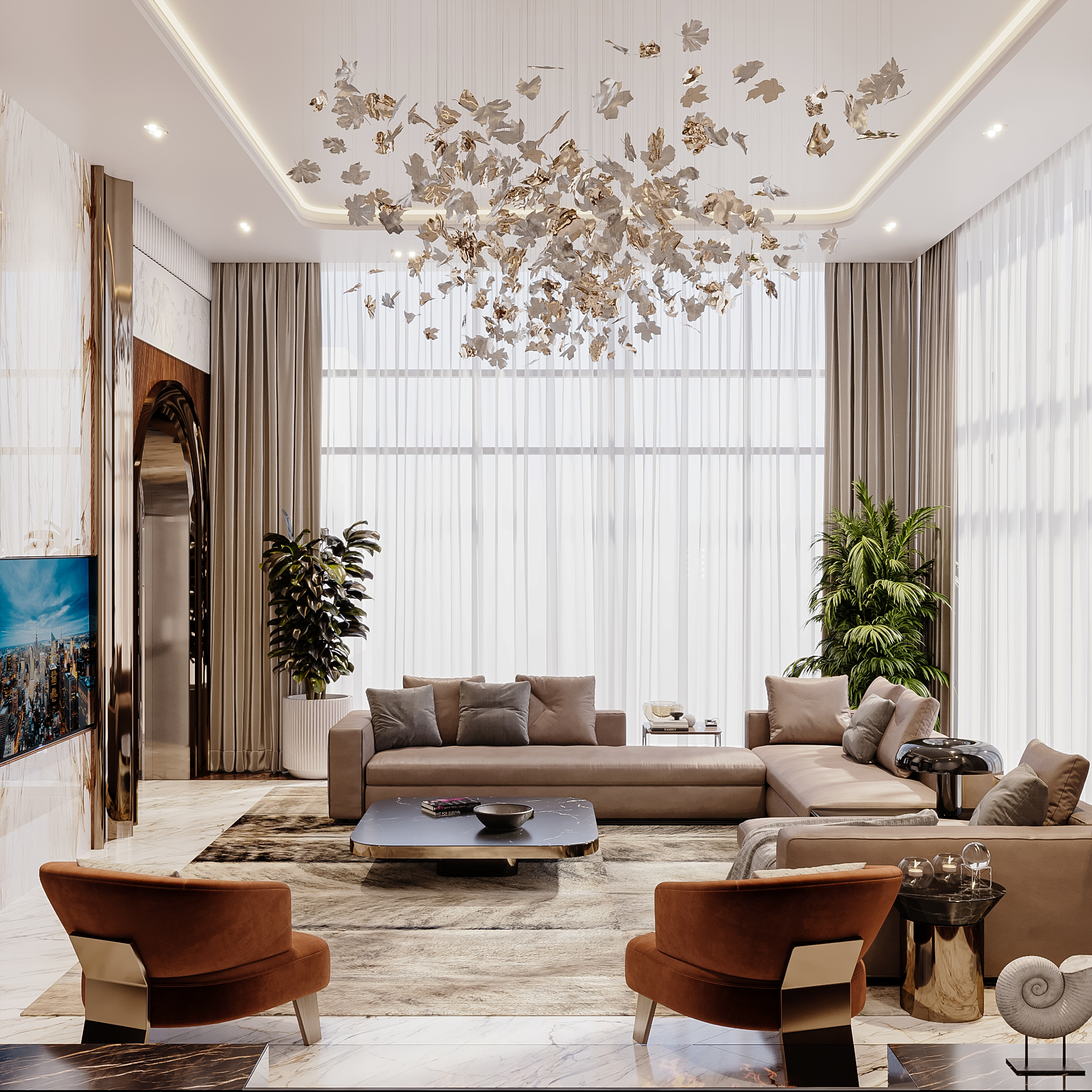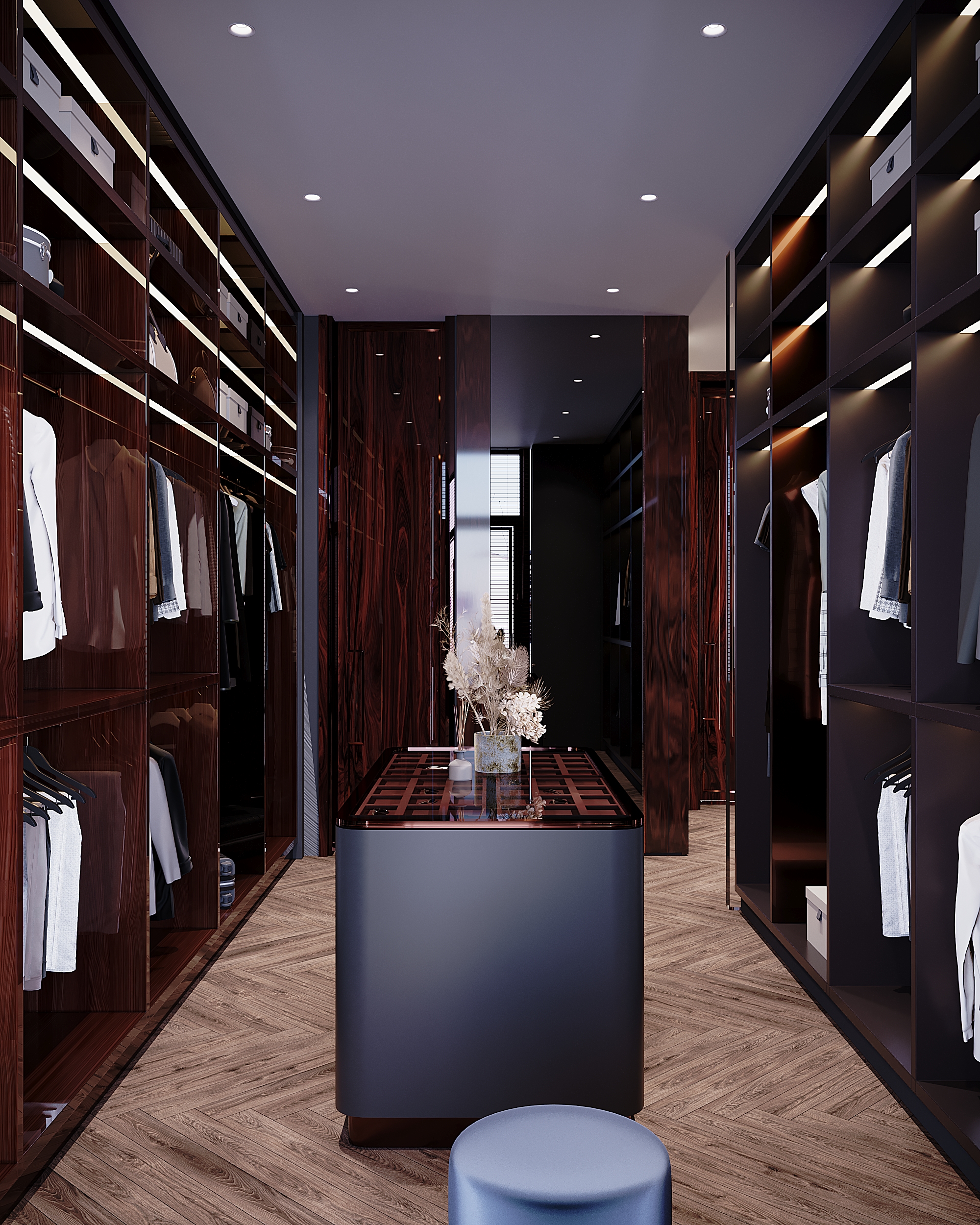 Интерьер сочетает светлый натуральный мрамор и благородные древесные текстуры, очень много металлических акцентов тёплого оттенка. Общественная зона формирует архитектурную структуру интерьера и подчёркивает эстетику современной неоклассики. Приватные помещения дома выполнены в более спокойное и камерной эстетики. Главная спальня оформлена с использованием мягких декоративных стеновых панелей и приглушенного освещения, создающего атмосферу уюта и приватности. В результате пространство выглядит статусно, гармонично и при этом остается комфортным для жизни большой семьи