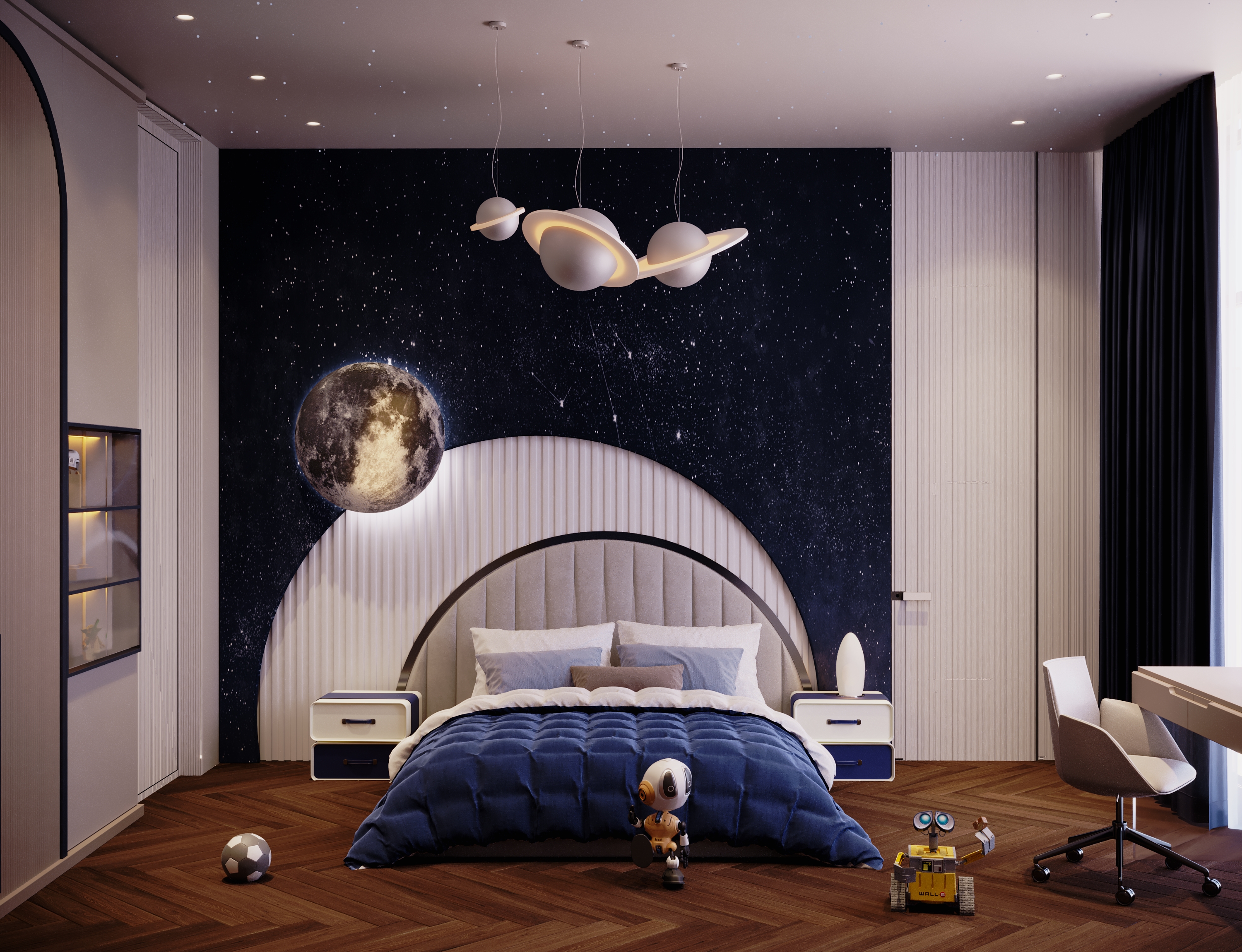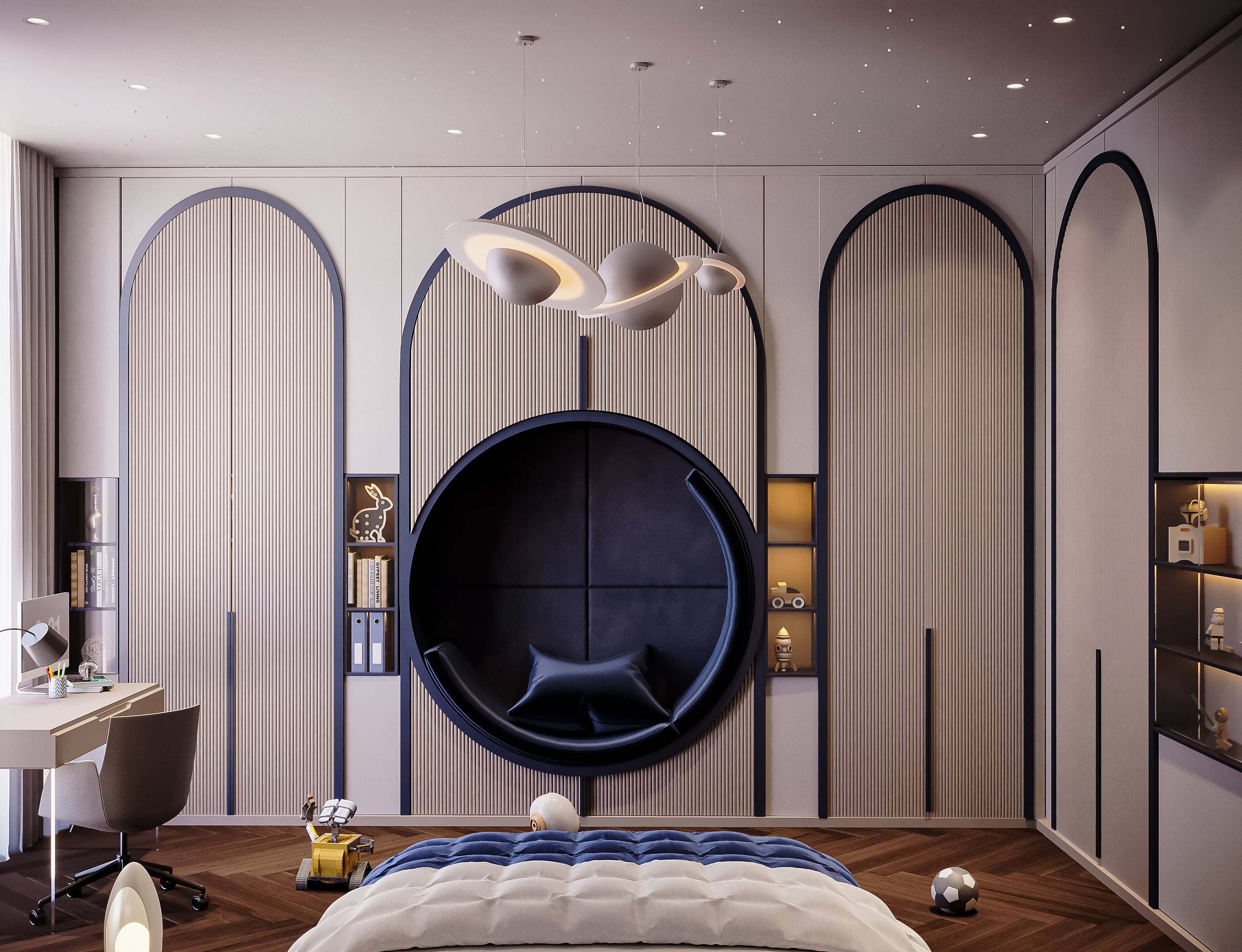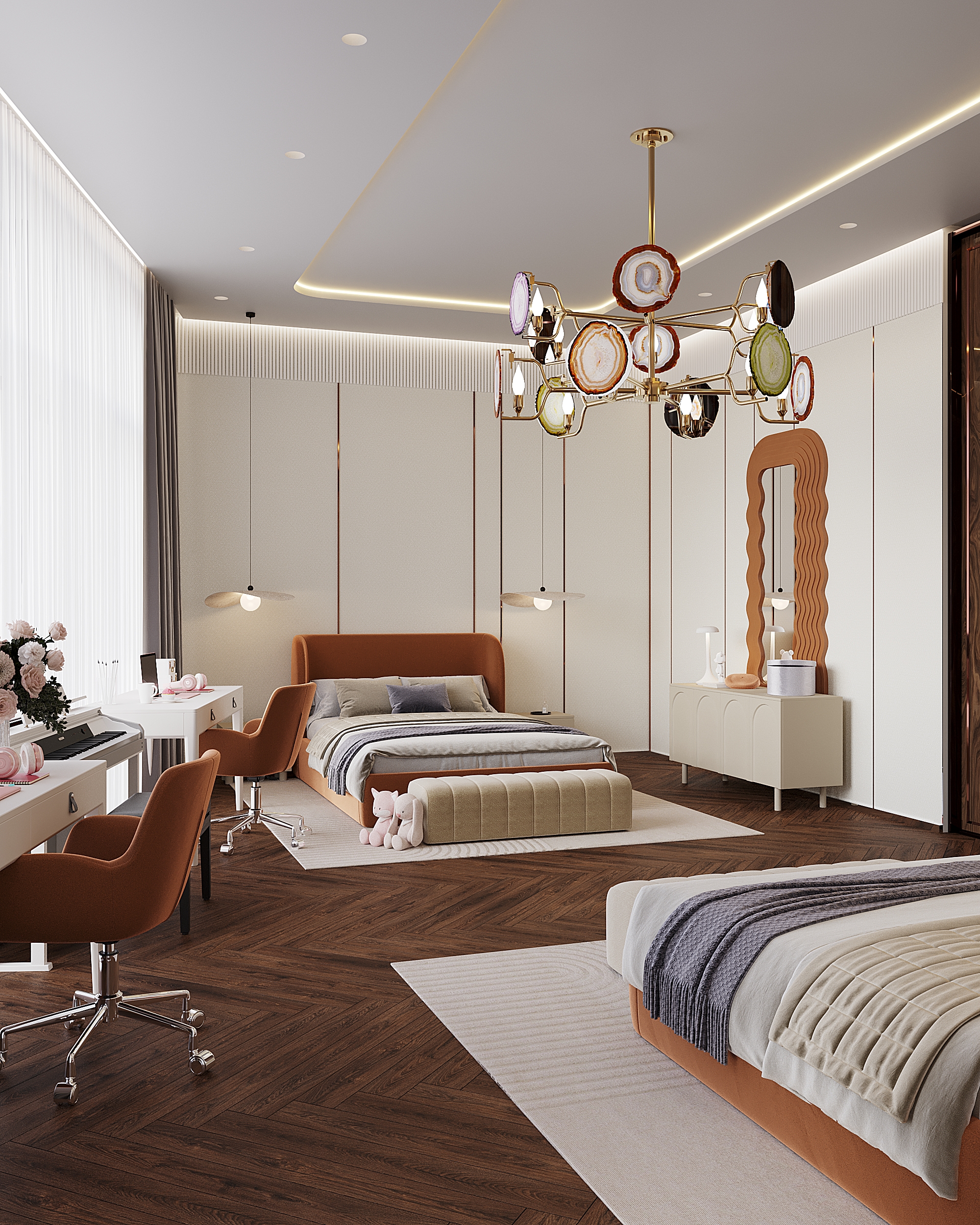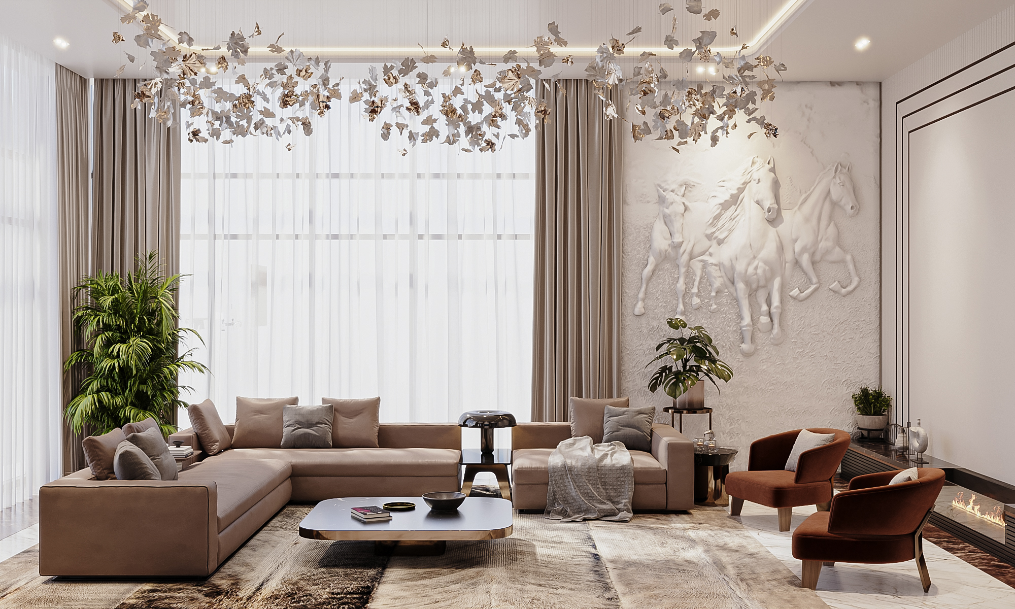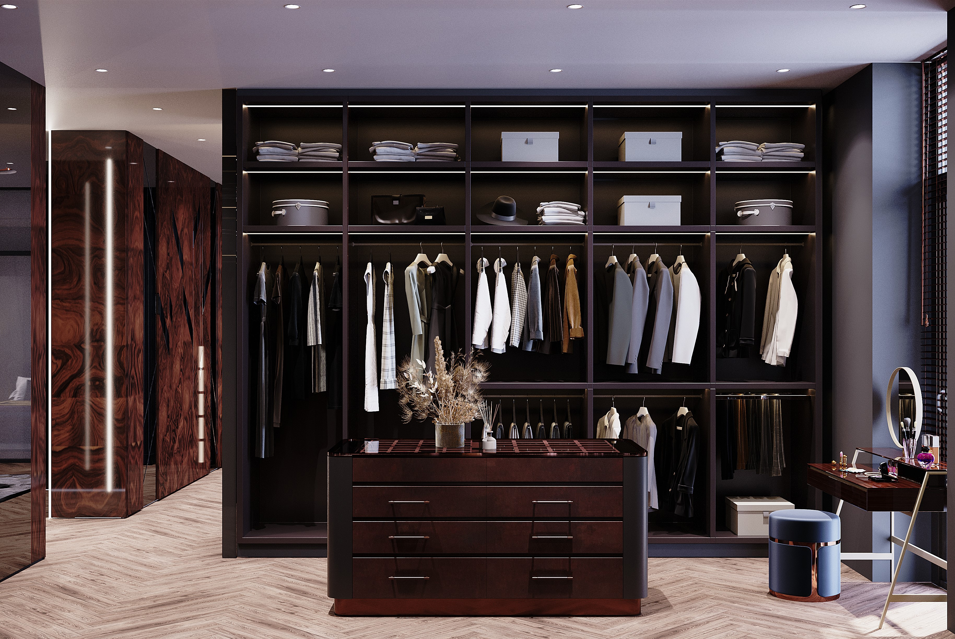 Интерьер сочетает светлый натуральный мрамор и благородные древесные текстуры, очень много металлических акцентов тёплого оттенка. Общественная зона формирует архитектурную структуру интерьера и подчёркивает эстетику современной неоклассики. Приватные помещения дома выполнены в более спокойное и камерной эстетики. Главная спальня оформлена с использованием мягких декоративных стеновых панелей и приглушенного освещения, создающего атмосферу уюта и приватности. В результате пространство выглядит статусно, гармонично и при этом остается комфортным для жизни большой семьи