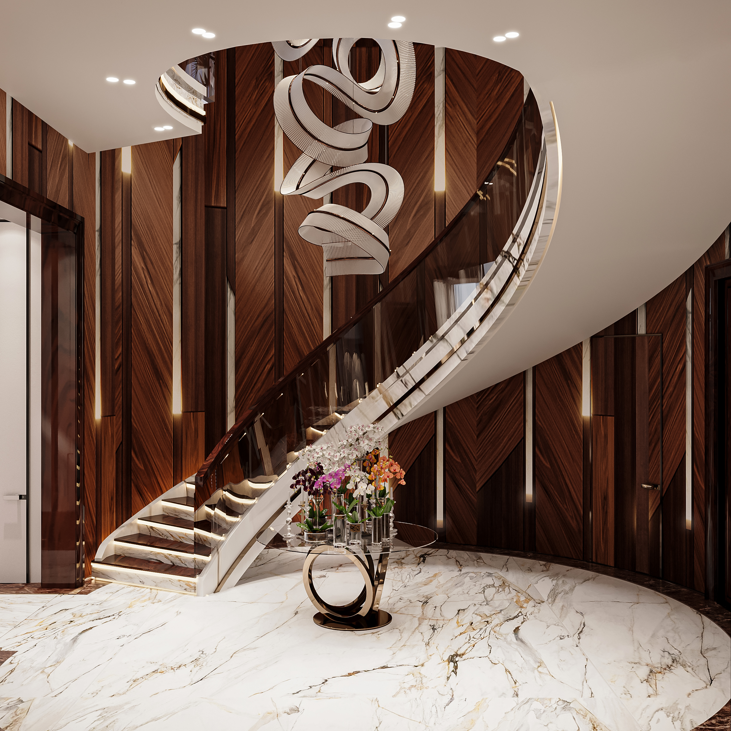 Главной задачей стало создание выразительного и функционального пространства. Интерьер выполнен в стиле модерн и Неоклассика. направления объединяющие классические пропорции, современную геометрию и премиальные натуральные материалы. Центральной точкой дома стал просторный холл с двойным светом и эффектной лестницей. Стены выполнены из натурального шпона вертикальные световые линии и декоративная световая инсталляция усиливает ощущение высоты и создают атмосферу парадного входного пространства.
